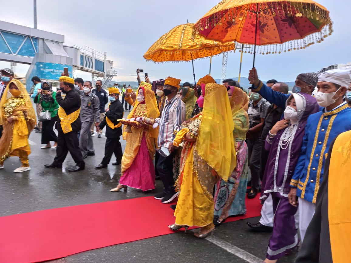 SultengTerkini.Com, PALU– Gubernur Sulawesi Tengah, Rusdy Mastura dan Wakil Gubernur (wagub) Ma’mun Amir bersama keluarga tiba di Kota Palu disambut dengan perpaduan adat Banggai dan Kaili di Bandara Mutiara SIS Aljufri, Jumat (18/6/2021).
