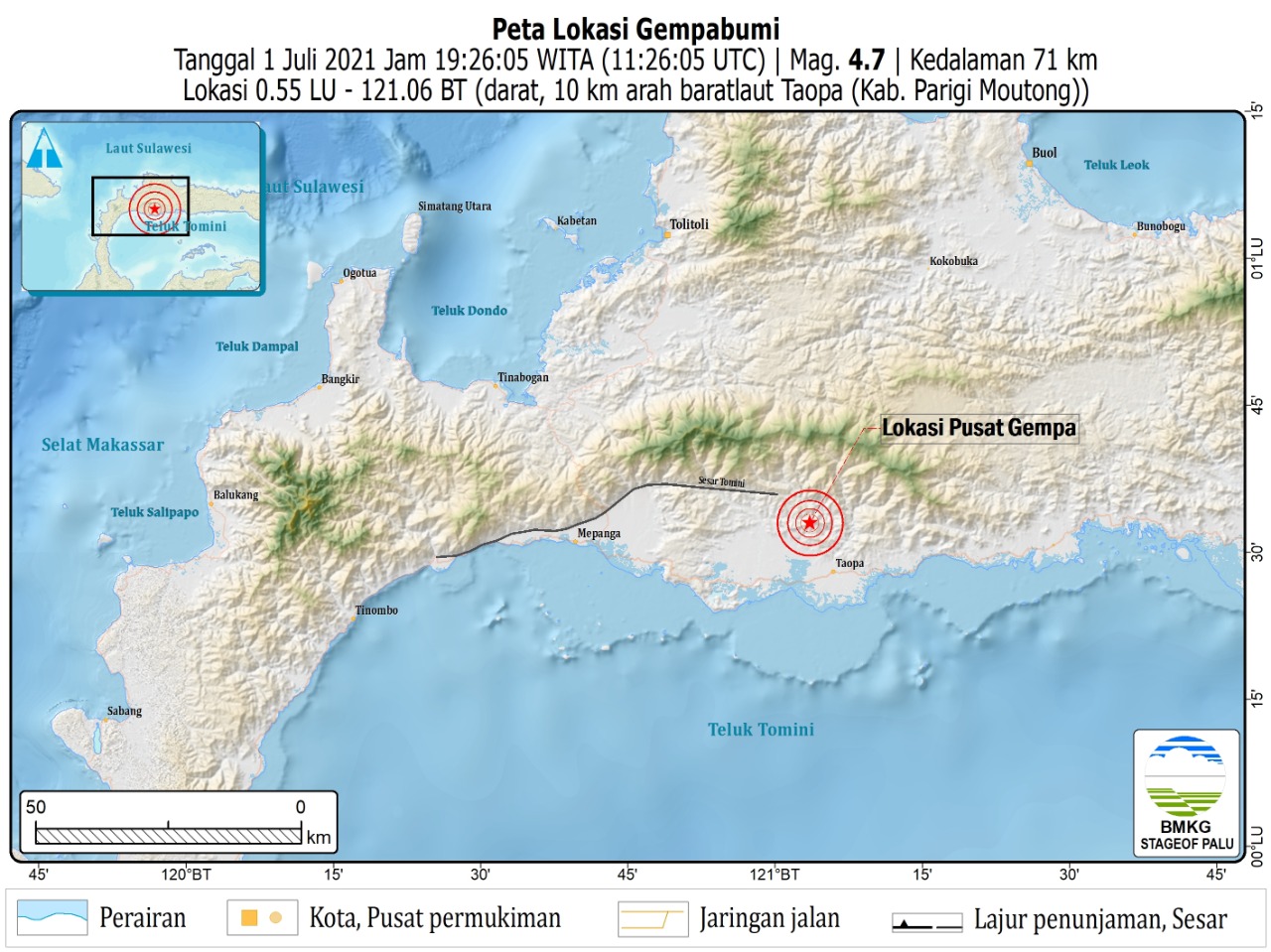 SultengTerkini.Com, PARIMO– Wilayah Taopa, Kabupaten Parigi Moutong (Parimo), Sulawesi Tengah diguncang gempabumi tektonik pada Kamis (1/7/2021) malam pukul 19:26 Wita.