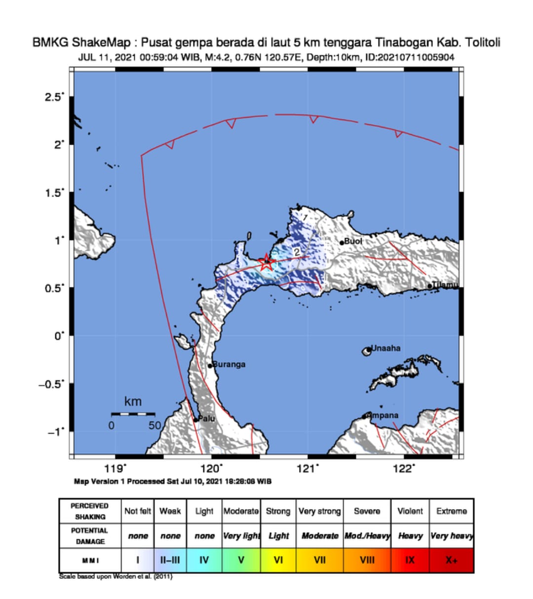 TOLITOLI– Wilayah Tinabogan, Kabupaten Tolitoli, Sulawesi Tengah diguncang gempa bumi tektonik pada Ahad (11/7/2021) pukul 01:59 Wita.