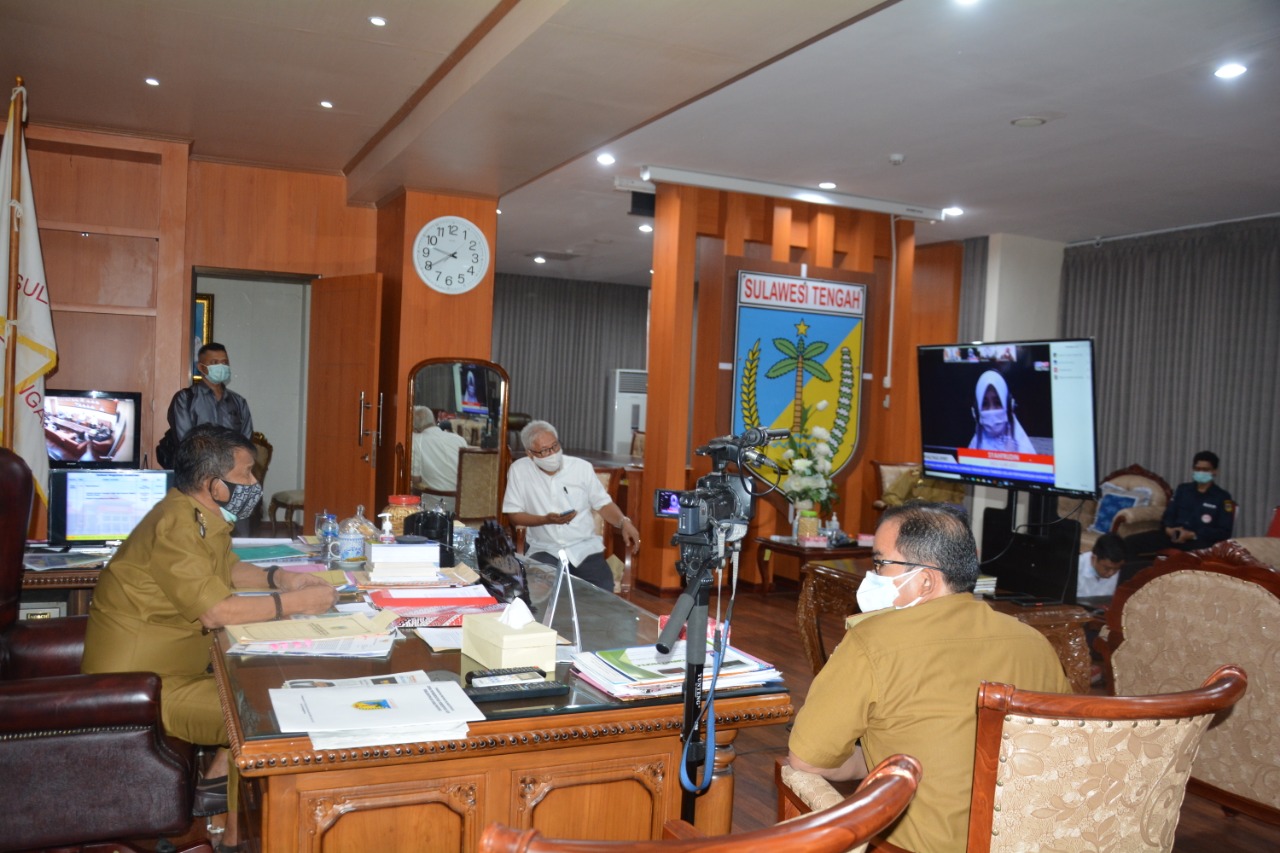PALU– Gubernur Sulawesi Tengah (Sulteng), Rusdy Mastura mengikuti live talk show secara virtual melalui RRI Tolitoli di ruang kerjanya, Senin (12/7/2021).