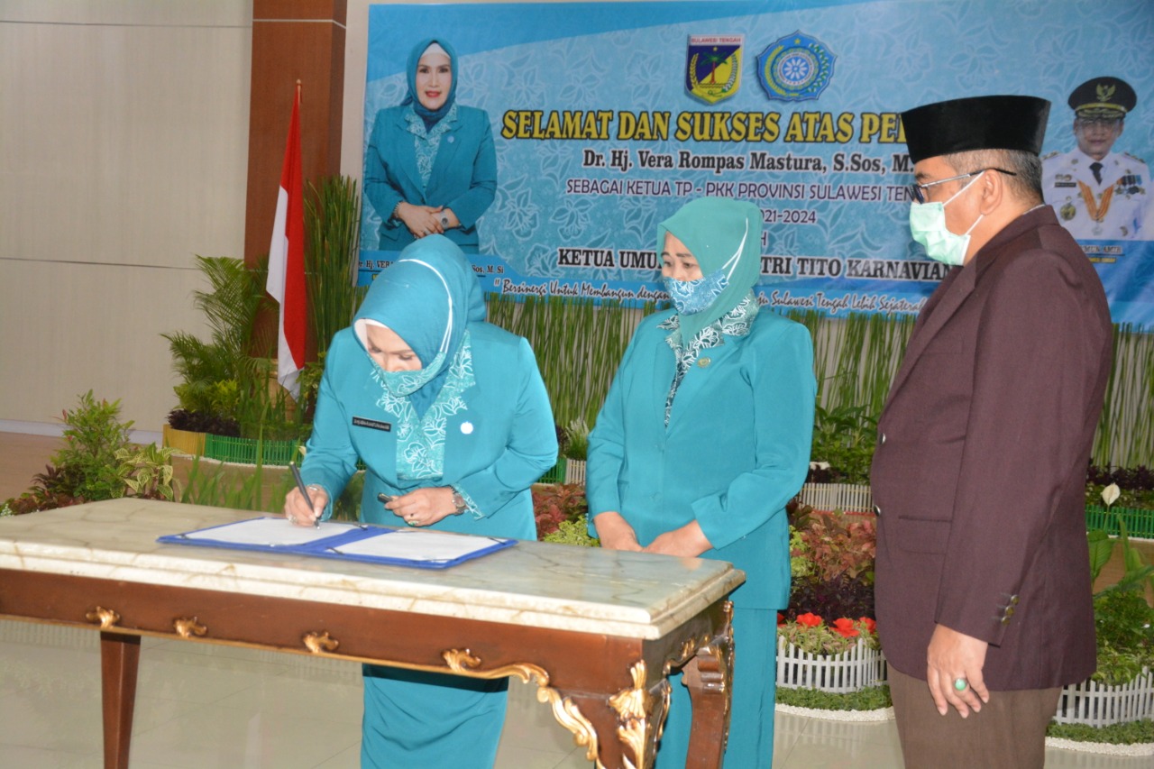 PALU– Vera Rompas Mastura resmi dilantik menjadi Ketua Tim Penggerak (TP) PKK Provinsi Sulawesi Tengah (Sulteng) oleh Ketua Umum TP-PKK, Tri Tito Karnavian, Rabu (14/7/2021).