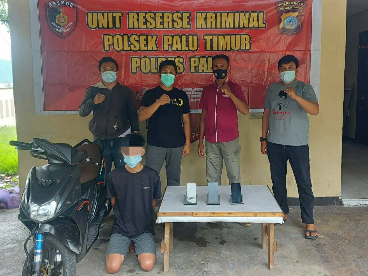 Adapun barang bukti yang berhasil diamankan polisi yakni tiga telepon genggam masing-masing Oppo F11 warna putih, RealMi C15 biru, dan Oppo A9 warna hitam, serta satu sepeda motor Yamaha Mio M3 warna hitam yang digunakan pelaku.