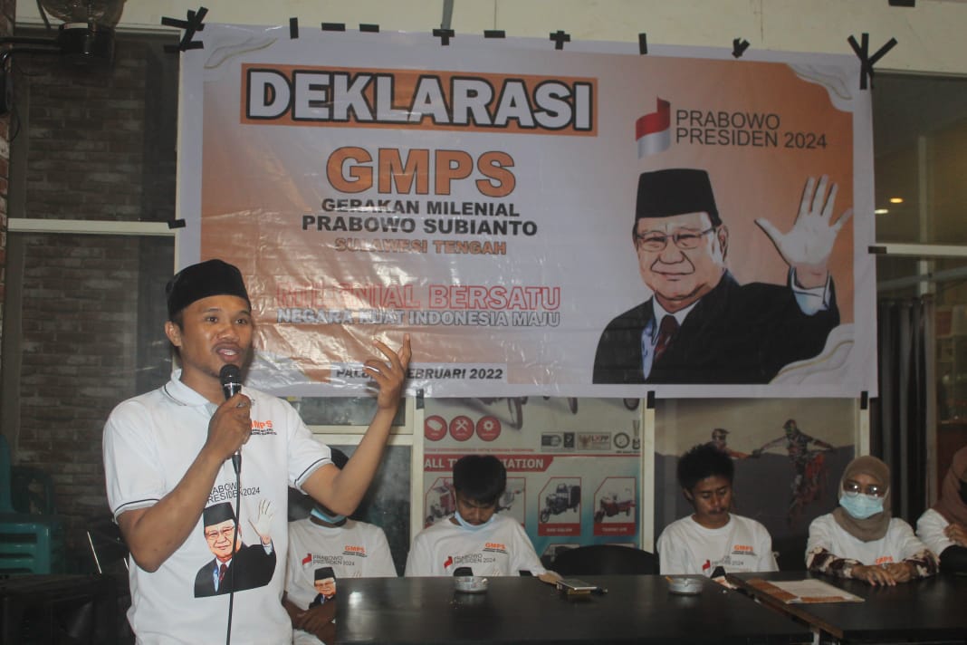 PALU– Gerakan Milenial Prabowo Subianto (GMPS) Sulawesi Tengah (Sulteng) mendeklarasikan dukungan kepada Ketua Umum Gerindra Prabowo Subianto sebagai Calon Presiden 2024 di sebuah warung kopi Jalan Diponegoro, Kota Palu, Sabtu (5/2/2022).