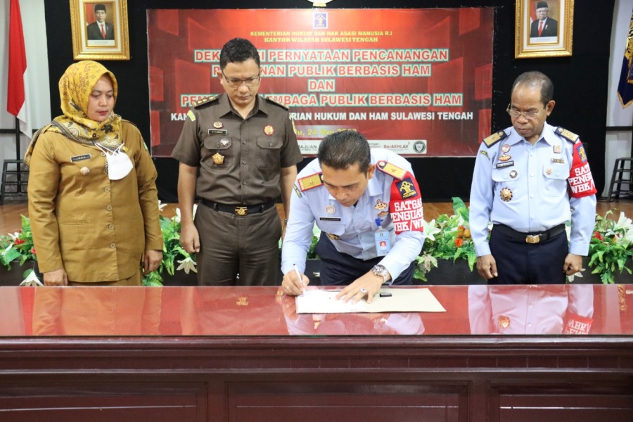 PALU– Pihak Kantor Wilayah (Kanwil) Kementerian Hukum dan Hak Asasi Manusia (Kemenkumham) Sulawesi Tengah (Sulteng) melaksanakan Deklarasi Pernyataan Pencanangan Layanan dan Pembinaan Lembaga Berbasis HAM tahun anggaran 2022 pada Selasa (24/5/2022).