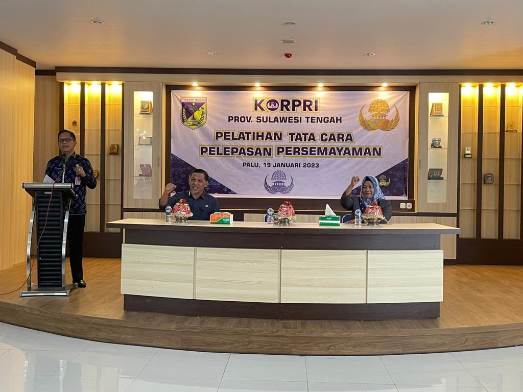 PALU– Gubernur Sulawesi Tengah (Sulteng), Rusdy Mastura diwakili Kepala Badan Pengembangan Sumber Daya Manusia (BPSDM) Adijoyo Dauda membuka Pelatihan Tata Cara Pelepasan Persemayaman Lingkup Korpri dan Pemerintah Daerah Provinsi Sulteng pada Kamis (19/1/2023).