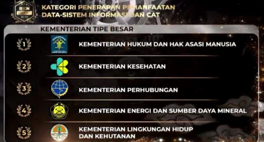 Penghargaan tersebut diraih dalam tiga kategori penilaian untuk kementerian tipe besar. Salah satunya bahkan meraih terbaik pertama dalam pemanfaatan sistem Computer Assisted Test (CAT).
