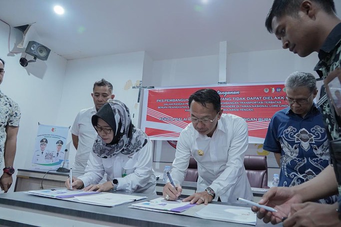 SIGI– Pemerintah Kabupaten (Pemkab) Sigi bersama Balai Besar Taman Nasional Lore Lindu menandatangani Perjanjian Kerja Sama berupa pembangunan strategis yang tidak dapat dielakkan dalam rangka pemanfaatan dan pengembangan transportasi terbatas yaitu peningkatan kualitas Jalan Bora-Pandere yang masuk dalam kawasan Taman Nasional Lore Lindu, di Aula Kantor Bupati Sigi, Kamis (31/8/2023).