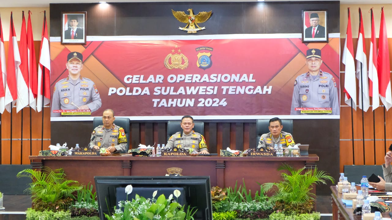 PALU– Kapolda Sulawesi Tengah (Sulteng), Irjen Polisi Agus Nugroho memimpin pelaksanaan Gelar Operasional tahun 2024 di Rupatama mapolda setempat pada Rabu (10/1).