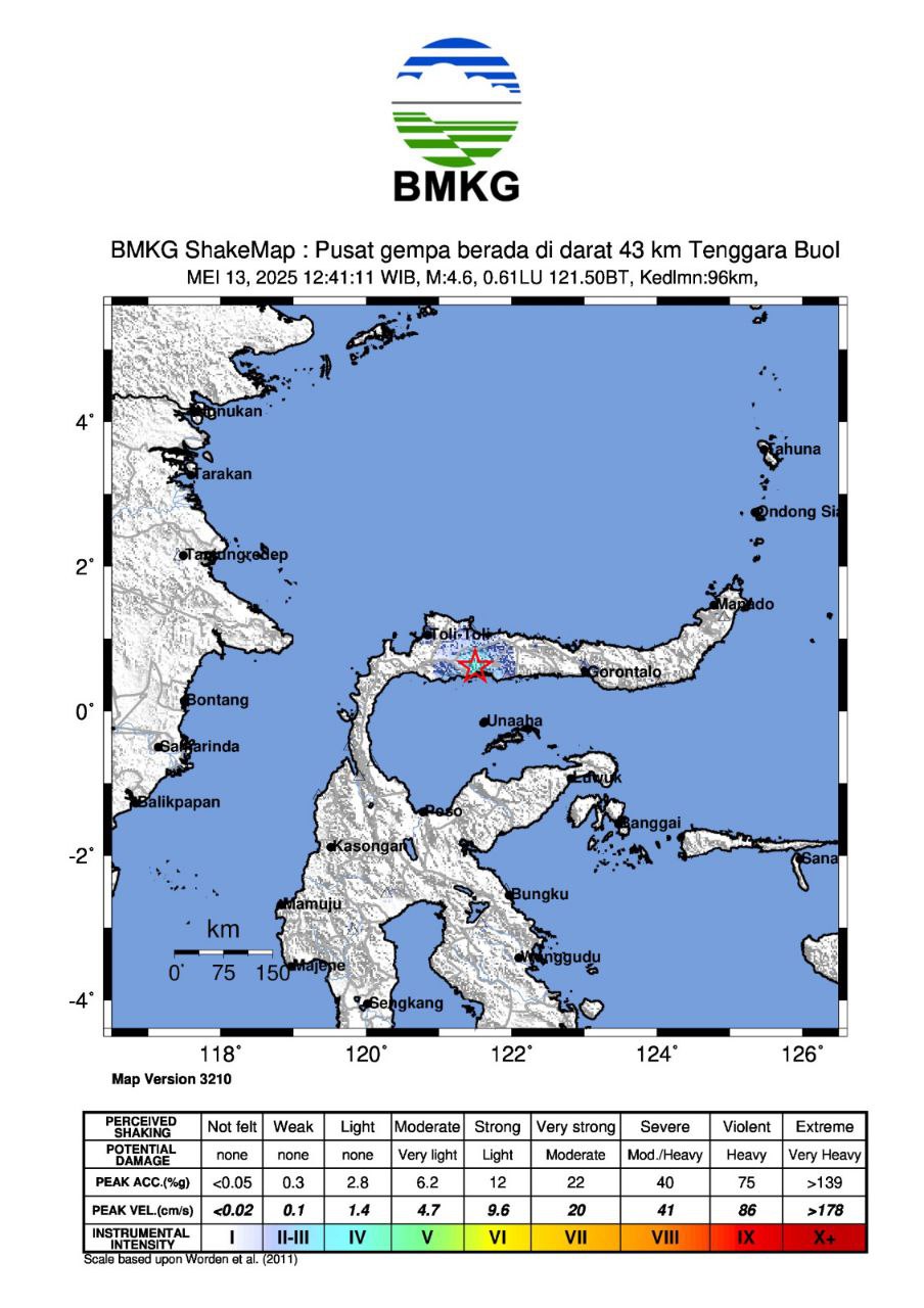 BUOL– Wilayah Kabupaten Buol, Sulawesi Tengah diguncang gempa bumi tektonik pada Selasa (13/5/2025) pukul 13:41:11 WITA.