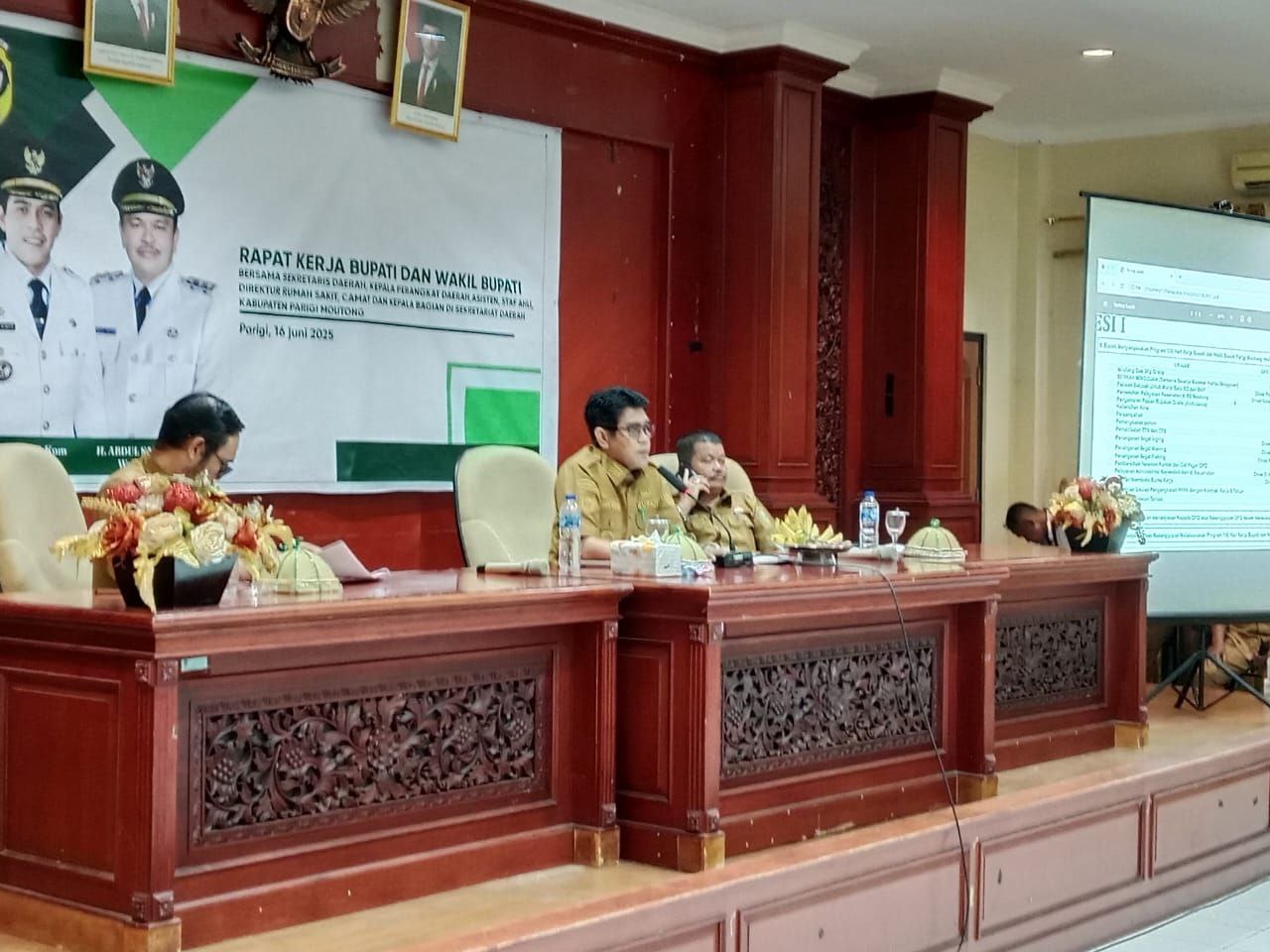 PARIMO– Bupati Parigi Moutong (Parimo), Erwin Burase bersama Wakil Bupati (Wabup) Abdul Sahid memimpin langsung rapat kerja perdana bersama jajarannya, Senin (16/6/2025).