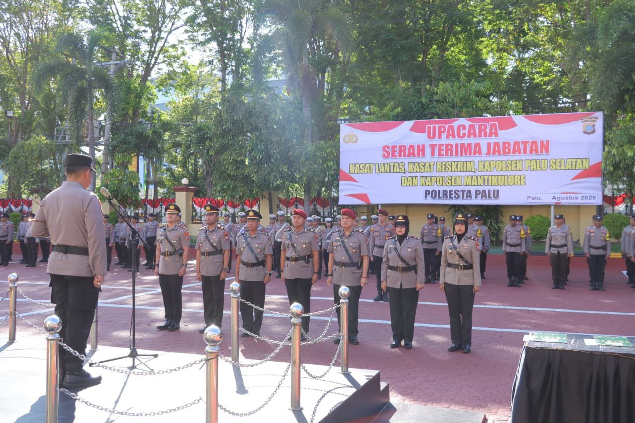 PALU– Pihak Polresta Palu menggelar serah terima jabatan Kapolsek Mantikulore, Kapolsek Palu Selatan, Kepala Satuan Lalu Lintas (Kasatlantas) dan Kepala Satuan Reserse Kriminal (Satreskrim) di halaman depan mapolresta setempat pada Selasa (5/8/2025).