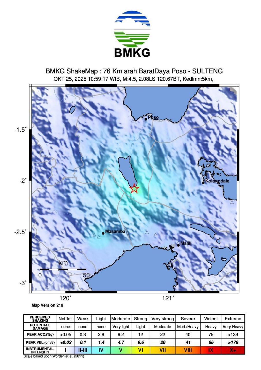 POSO– Wilayah Pamona, Kabupaten Poso, Sulawesi Tengah diguncang gempa bumi tektonik pada Sabtu (25/10/2025) pukul 11:59:17 Wita.