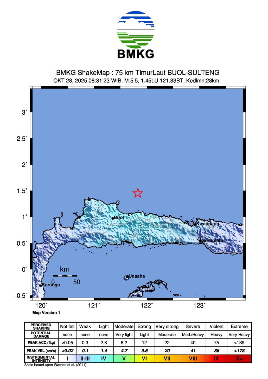 BUOL– Wilayah Pantai Utara Buol, Sulawesi Tengah diguncang gempa tektonik pada Selasa (28/10/2025) pukul 09.31.23 Wita.