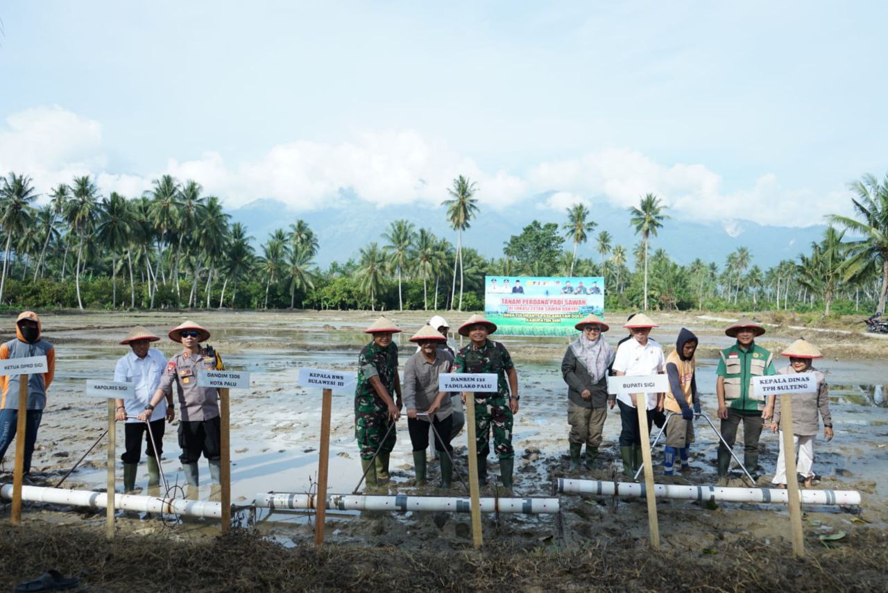 SIGI– Bupati Sigi, Mohamad Rizal Intjenae melakukan penanaman perdana padi di lokasi cetak sawah baru bersama Danrem 132/Tadulako, Brigjen TNI Deni Gunawan di Desa Tulo Rantea, Kecamatan Dolo pada Jumat (26/12/2025).