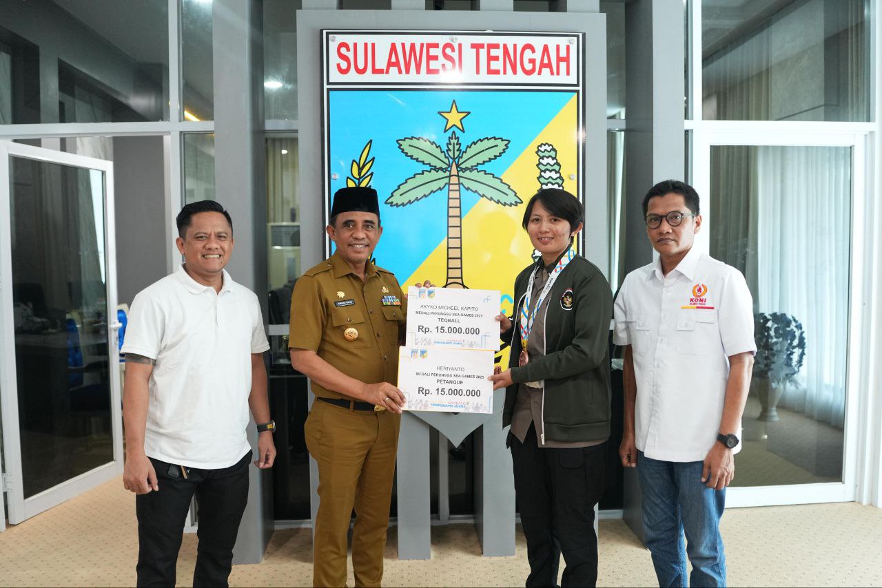 PALU– Gubernur Sulawesi Tengah (Sulteng), Anwar Hafid didampingi KONI Sulteng menyerahkan bonus kepada dua atlet asal Sulteng yang sukses mengharumkan nama daerah pada ajang SEA Games Thailand 2025.