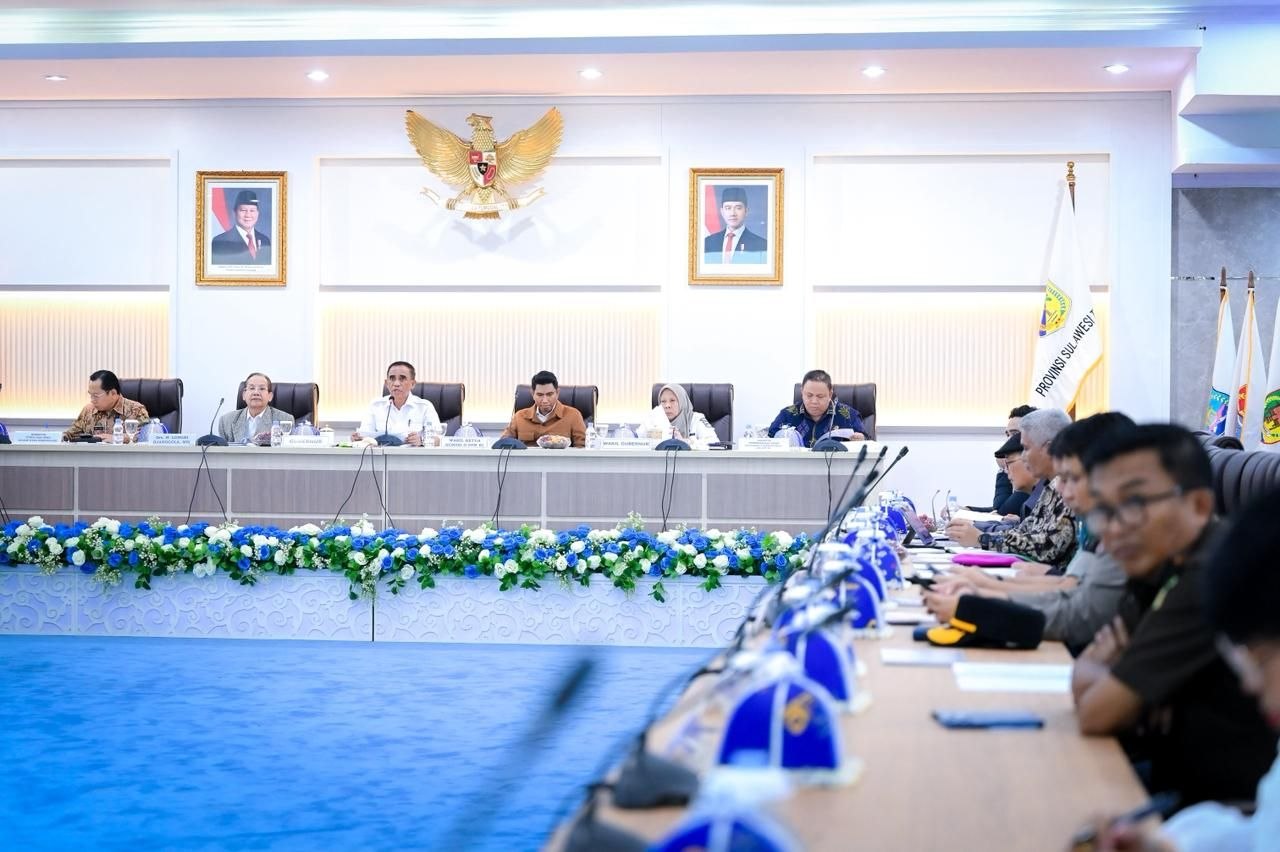 PALU– Gubernur Sulawesi Tengah (Sulteng), Anwar Hafid bersama Wakil Gubernur (Wagub) Reny A Lamadjido serta Sekretaris Provinsi Novalina menyampaikan ucapan selamat datang kepada tim kunjungan kerja (kunker) Komisi II DPR RI yang dipimpin Wakil Ketua Bahtra Banong dalam rapat di Ruang Polibu kantornya, Rabu (22/4/2026).